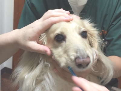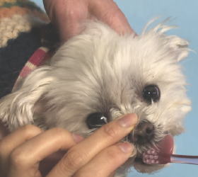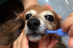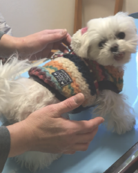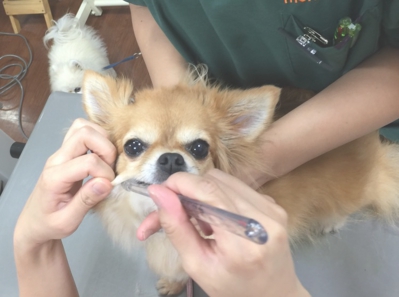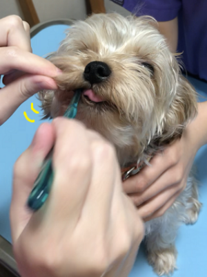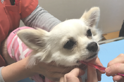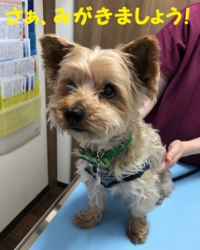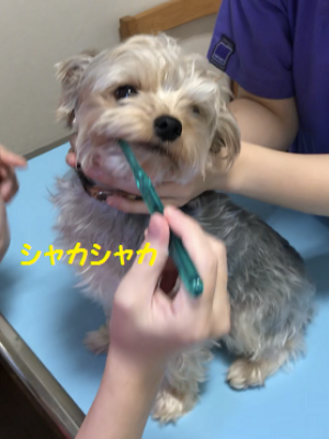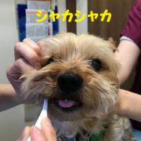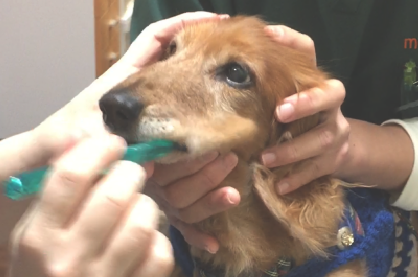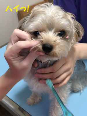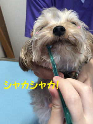 『歯みがき大好き!』やる気あふれるモカちゃんは、ほかのワンちゃんがちょっと苦手。だけど、お父さんお母さんの肩にのって、毎日がんばって通っています♪