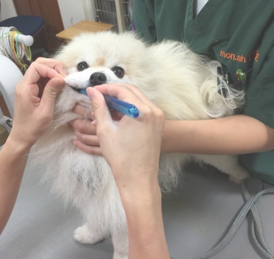 マミちゃんは2キロちょっとの小さな女の子。おくちも特別小さいので、小さな歯ブラシでみがきます。歯も小さいからむずかしい!でも、きちんとみがけたときは、ブラッシングの音でちゃ〜んとわかりますよ♪